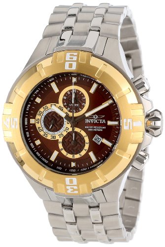 Brown dial with gold tone and white hands and hour markers; luminous; unidirectional 18k gold ion-plated stainless steel outer bezel; tachymeter scale on inner bezel; screw-down crown and pushers