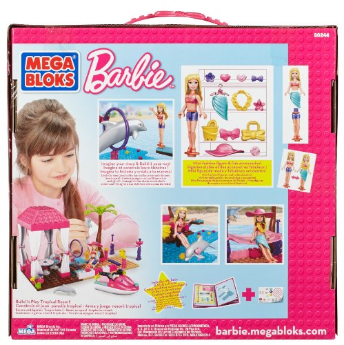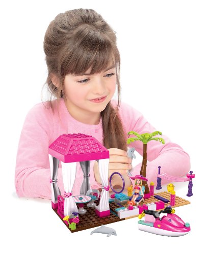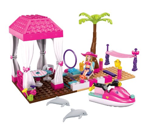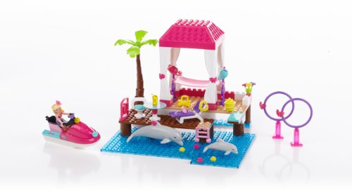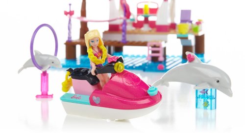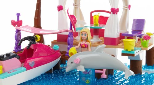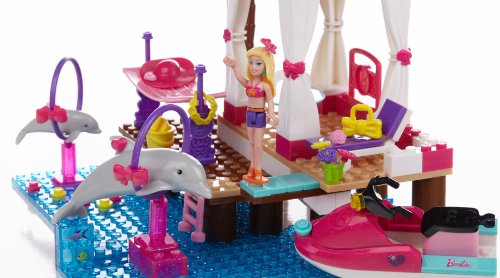 -. Feature : A buildable dreamy pier, water baseplates and jet ski / Dolphin Fun Barbie mini-fashion figure and 2 fun dolphins / Cute and fun accessories like a glittering block stand, buildable beach chair, hammock, pail and dolphin hoops / Combine with all of the Mega Bloks Barbie sets to build a fabulous world of fashion, friends and fun