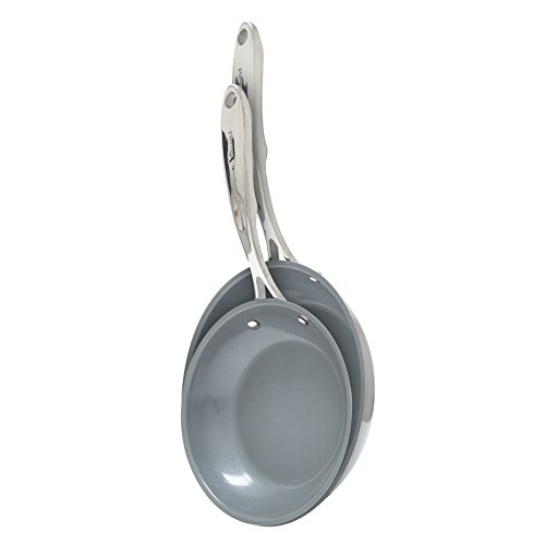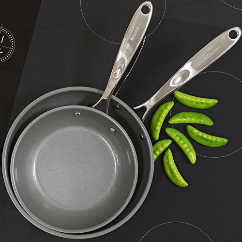 Made from strong Japanese steel, the construction and design of the induction 21 steel cookware line guarantee superior quality. The ceramic coating is PFOA and PTFE free making it healthy nonstick pan. No toxic fumes are released during heating. The fry pan's main body has copper melted into the steel, which effortlessly conducts heat quickly and evenly. Titanium is also added for strength and durability to endure everyday cooking. To ensure healthy cooking, the steel is nickel free to prevent allergic reactions to nickel. The dripless pouring rim reduces spillage along the side of the body. This ceramic coated fry pan is the perfect choice for frying eggs, searing fish fillets, browning chicken breasts and sauteing vegetables. It features a wide flat bottom, sloped sides and a cool to the touch, long ergonomic handle. This is the best steel for magnetic induction and perfect for all cooktops. Oven safe up to 500 Degree F. Hand wash only. Limited 2 year warranty. 2-piece set includes 8-inch fry pan & 10-inch fry pan.Feature