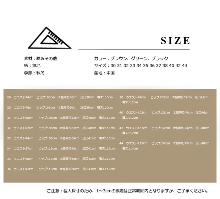 カーゴパンツ メンズ 太め ロングパンツ スリム 迷彩カーゴパンツ 大きいサイズ スウェットパンツ ストレッチ ボトムス 無地 裏起毛 2017秋冬新作 カーゴパンツ メンズ 太め スリム ロングパンツ ボトムス商品詳細素材:綿&その他柄:無地季節:秋冬カラー:ブラウン、グリーン、ブラックサイズ:30 31 32 33 34 35 36 37 38 40 42 44産地:中国サイズ参照表29 ウエスト74cm ヒップ100cm 太腿周り60cm 足口38cm 着丈110cm30 ウエスト76cm ヒップ103cm 太腿周り60cm 足口39cm 着丈110cm31 ウエスト80cm ヒップ106cm 太腿周り62cm 足口40cm 着丈110cm32 ウエスト82cm ヒップ106cm 太腿周り62cm 足口40cm 着丈110cm 33 ウエスト84cm ヒップ108cm 太腿周り64cm 足口41cm 着丈110cm34 ウエスト87cm ヒップ113cm 太腿周り66cm 足口41cm 着丈112cm35 ウエスト90cm ヒップ115cm 太腿周り66cm 足口42cm 着丈112cm 36 ウエスト92cm ヒップ118cm 太腿周り68cm 足口43cm 着丈112cmご注意:個人採寸のため、1~3cmの誤差は正常範囲内となりますが、ご了承ください。 カーゴパンツ メンズ 太め ロングパンツ スリム 迷彩カーゴパンツ 大きいサイズ スウェットパンツ ストレッチ ボトムス 無地 裏起毛 2017秋冬新作 カーゴパンツ メンズ 太め スリム ロングパンツ ボトムス