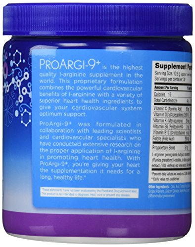 -. Binding : Health and Beauty -. Brand : Synergy -. EAN : 0884734296102 -. Feature : ProArgi9 may help improve heart and vascular health. -. IsAdultProduct : 0 -. Label : Synergy -. LegalDisclaimer : We do not except returns on opened canister, box, or tampered products. Must be 18 yrs or over to purchase -. Manufacturer : Synergy -. PackageQuantity : 1 -. ProductGroup : Health and Beauty -. ProductTypeName : HEALTH_PERSONAL_CARE -. Publisher : Synergy -. Studio : Synergy -. Title : Proargi9 Plus (Grape Flavor) Canister -. UPC : 881619971321