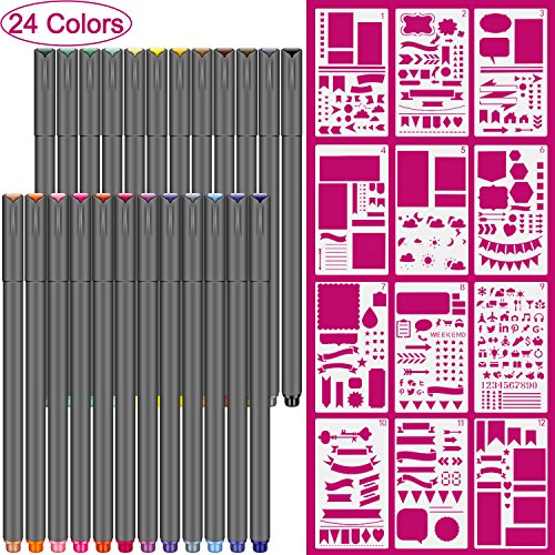 Bullet Journal Supplies, 24 color fineliner pens and 12 pieces Notebook Diary Scrapbook Templates Plastic Planner Kit