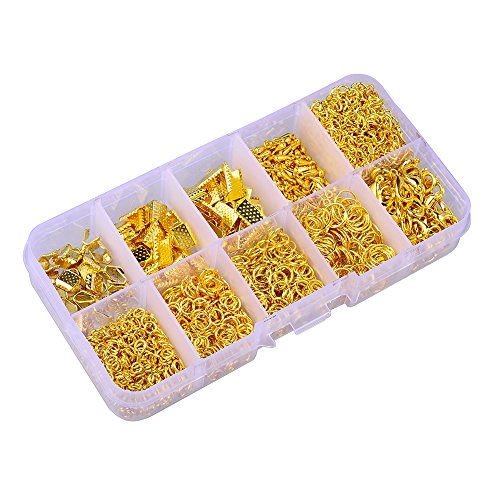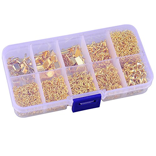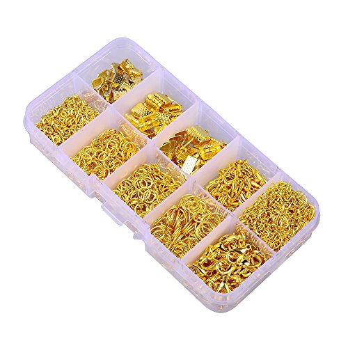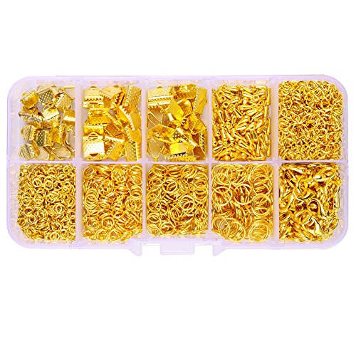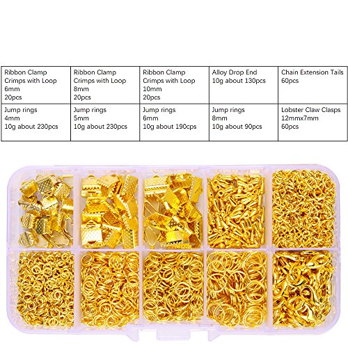In A Box(1030pcs/box) Kit With Gold Plated Jump Rings 4mm 5mm 6mm 8mm 780 Pcs and Lobster Clasps 12mm 60 Pcs and Ribbon Clamp Crimps with Loop 6mm 8mm 10mm 60 Pcs and 130 Pcs Alloy Drop End