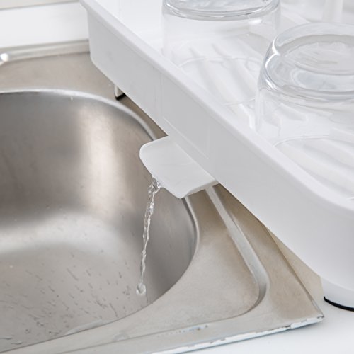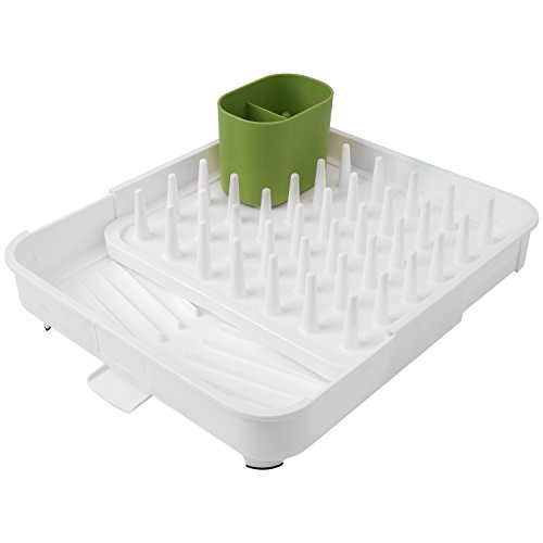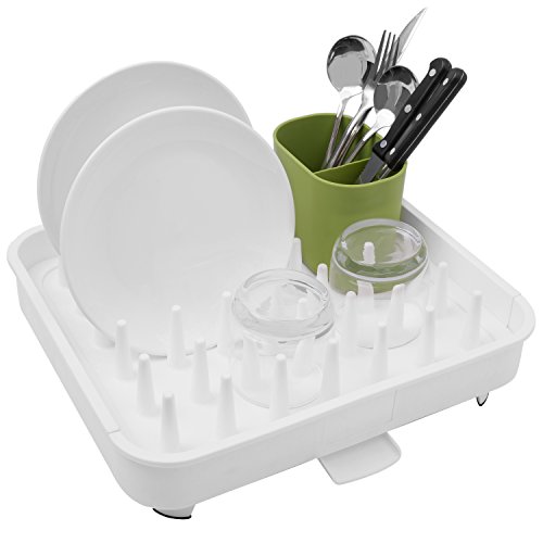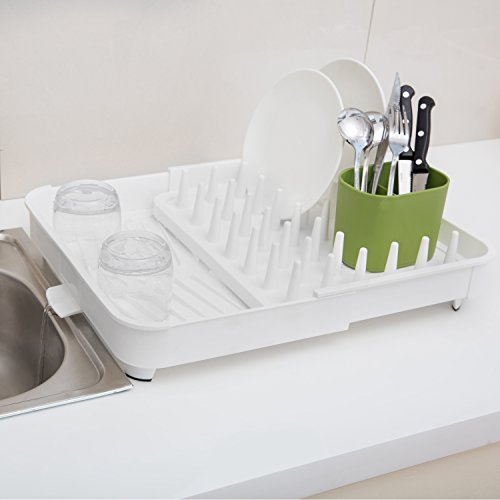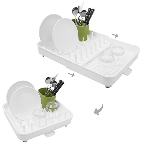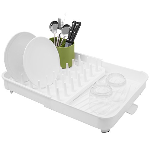 White Plastic Expandable Kitchen Dish Drying Rack with Drainage Plug and Removable Utensil Cup
