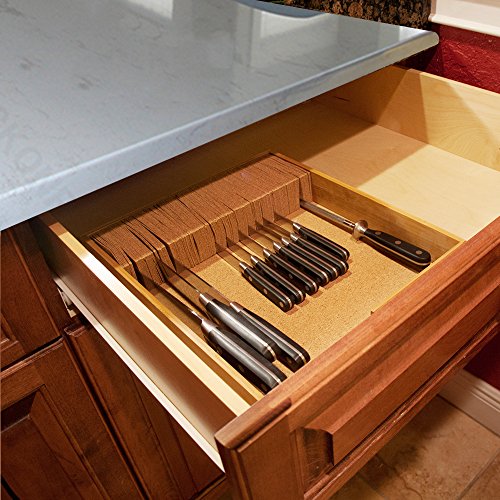 Free up your kitchen counter space. Keep your knives & utensils easily accessible. Natural cork holds your knives securely in place, keeping your hands safe from any misplaced blades. Open your drawer & easily pick out the cutlery you want. Deluxe dock can accommodate short or long handled knives