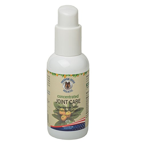 Made in the USA, our innovative Freedom Dogs Holistic Canine Joint Care Formula is a naturally derived supplement. Containing Glucosamine, MSM, Chondroitin, Magnesium, Collagen-2 and Loquat, this holistic concentrated liquid formulation helps provide support and maintenance for healthy joints. While other supplements are taken in pill form; we have a pump that is easily administered and helps ease the pain of your dog in half the time. Simply pump the recommended dose onto your dog food and watch how quickly our Canine Joint Care Formula is absorbed. There are 118 doses in the bottle, enough for 3 months! Freedom Dogs Holistic Canine Joint Care Formula works for even your pickiest eaters! We also proudly sponsor Pets for Patriots, the non-profit organization that saves lives by helping United States military veterans adopt dogs and cats at risk of being euthanized or permanently homeless. Freedom Dogs is a Cruelty Free company with no animals harmed in testing.Feature
