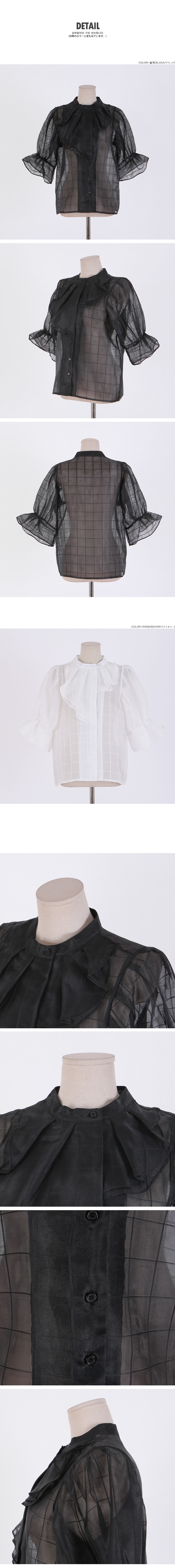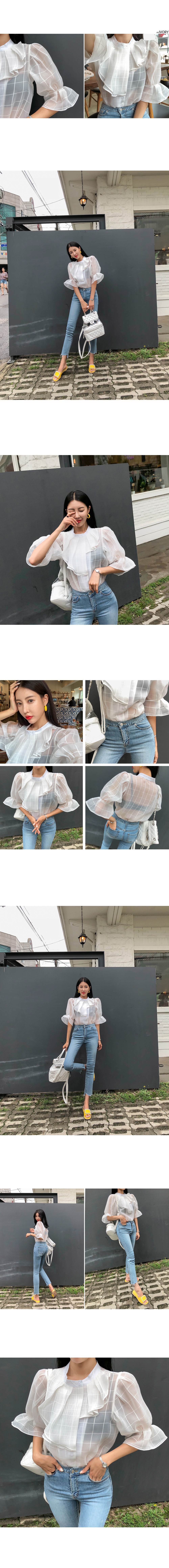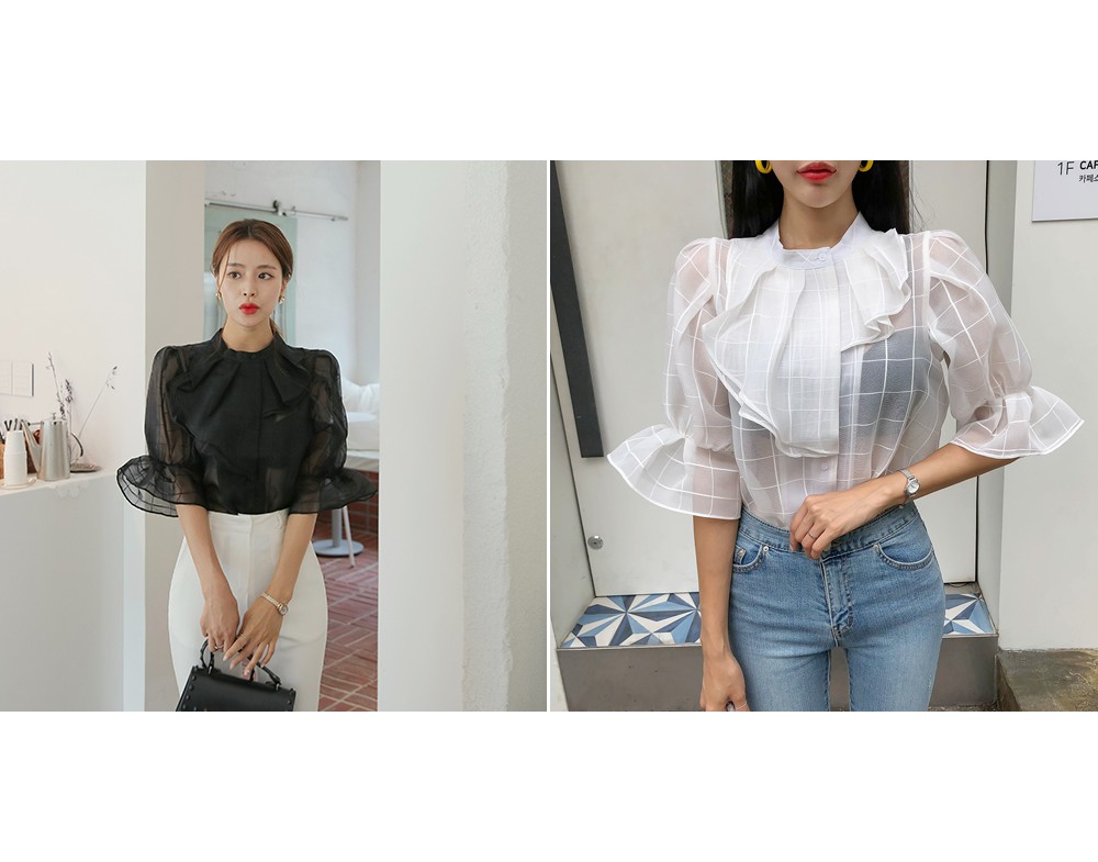 청순청순한 느낌의 다바 블라우스를 소개해요. 쇄골까지 가려지는 차이나카라넥으로 단추클로징이 되어지구요, 네크라인 밑으로 언발라인의 프릴디테일로 여성스러운 느낌!! 퍼프소매로 벌룬감있는 팔라인 연출을 도와준답니다. 얇은 원단감으로 은은하게 비치는 시스루 원단이라 섹시하게 보여지기까지~~ 흔하지 않은 블라우스에 사각패턴으로 유니크한 느낌도 있네요 데님에 여성스러운 캐쥬얼룩으로 연출해도 참 예쁘구요, 슬렉스나 스커트에 단아하게 코디해도 좋은 블라우스!! 아이,블랙 2컬러로 진행해요~ FREE(44-66)사이즈 분들께 추천드리구요, 평소 44반 사이즈 착용하는 모델들은 여유있는 핏으로 맞았답니다. size tip모델착용 사이즈는 Free(44-66) 입니다