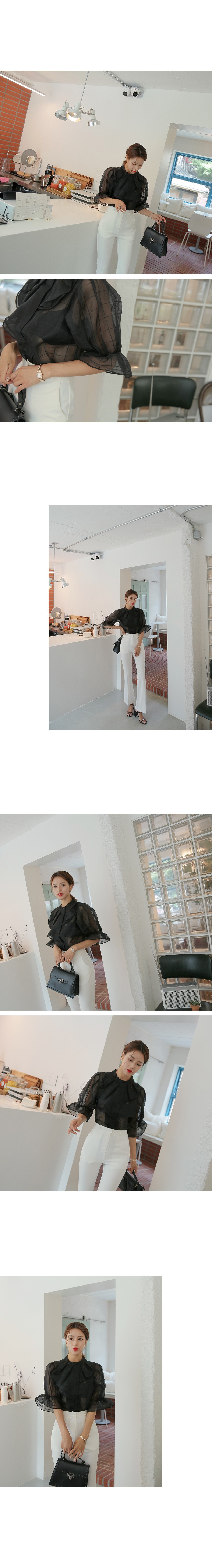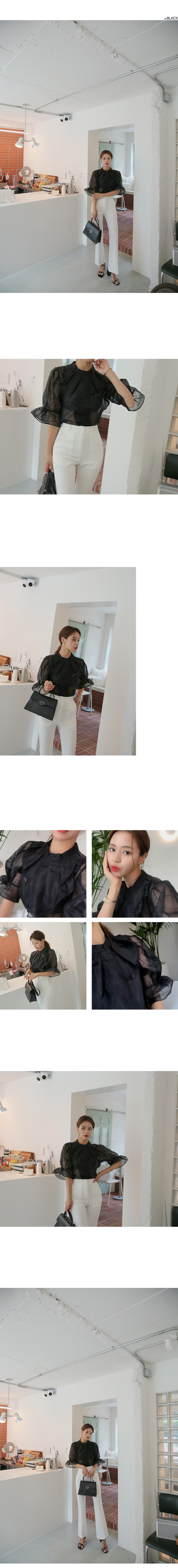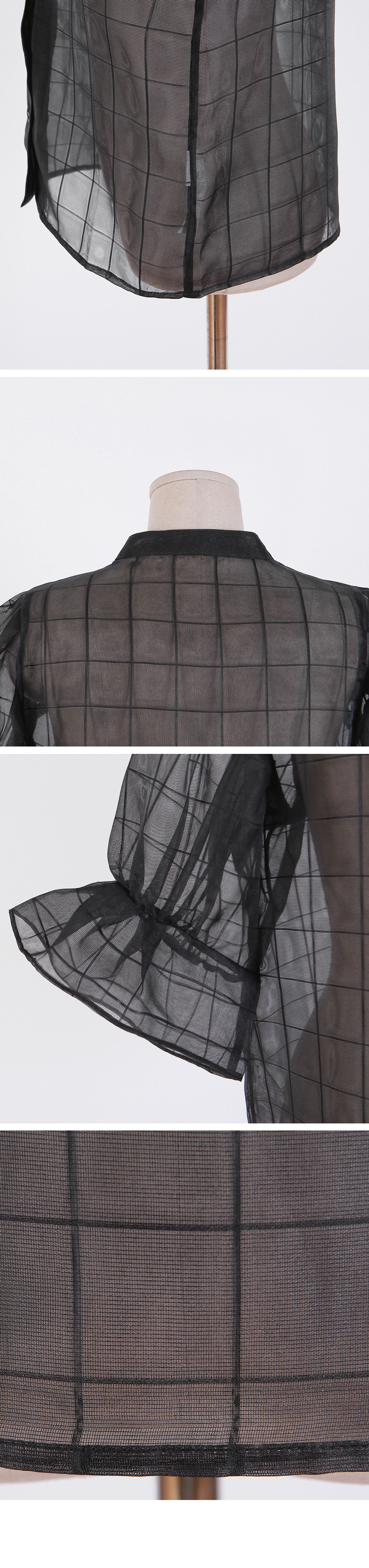 청순청순한 느낌의 다바 블라우스를 소개해요. 쇄골까지 가려지는 차이나카라넥으로 단추클로징이 되어지구요, 네크라인 밑으로 언발라인의 프릴디테일로 여성스러운 느낌!! 퍼프소매로 벌룬감있는 팔라인 연출을 도와준답니다. 얇은 원단감으로 은은하게 비치는 시스루 원단이라 섹시하게 보여지기까지~~ 흔하지 않은 블라우스에 사각패턴으로 유니크한 느낌도 있네요 데님에 여성스러운 캐쥬얼룩으로 연출해도 참 예쁘구요, 슬렉스나 스커트에 단아하게 코디해도 좋은 블라우스!! 아이,블랙 2컬러로 진행해요~ FREE(44-66)사이즈 분들께 추천드리구요, 평소 44반 사이즈 착용하는 모델들은 여유있는 핏으로 맞았답니다. size tip모델착용 사이즈는 Free(44-66) 입니다