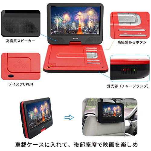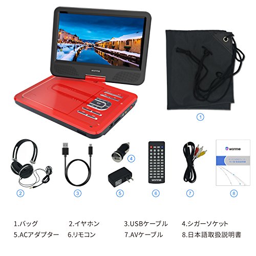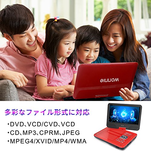 ■270度回転液晶モニターで広い範囲に映像を楽しむ!! 右側に90度。左側に180度。合計で270度液晶画面が回転します。見やすい角度に調整ができさらに折りたたんでコンパクトに視聴することも可能です。 | ■明るさ調整可能 「明るさ」や「コントラスト」なども調整でき、明るい場所でも暗い場所でもご覧いただけます。 | ■付属品 WONNIE ポータブルDVDプレーヤー、バック、イヤホン、AVケーブル、シガーソケットアダプター、リモコン、ACアダプター、取扱説明書。 |