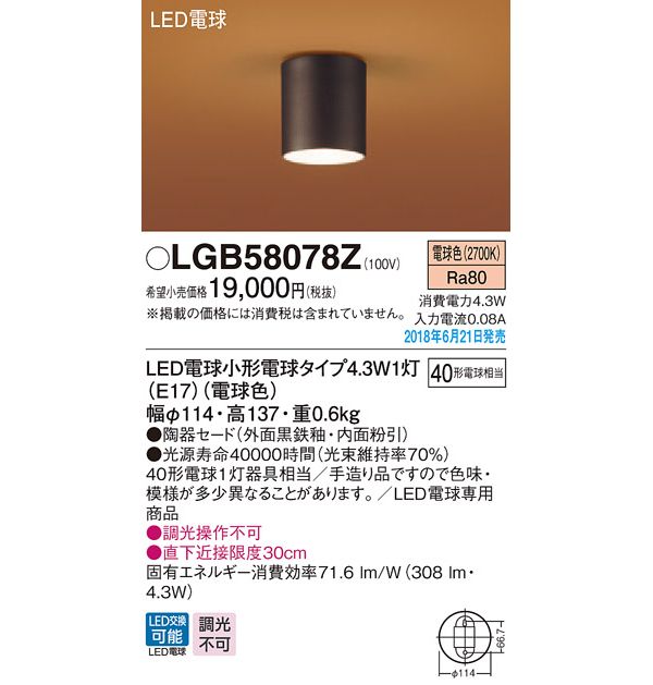 ●光源:LED電球小形電球タイプ4.3W1灯(E17)(電球色)、色温度:2700K、光源寿命40000時間(光束維持率70%)