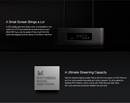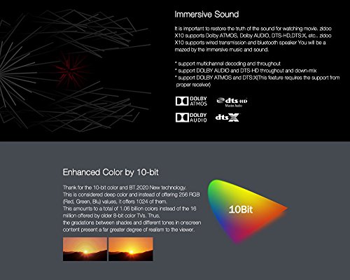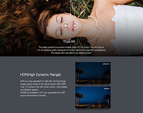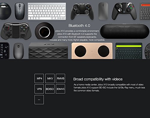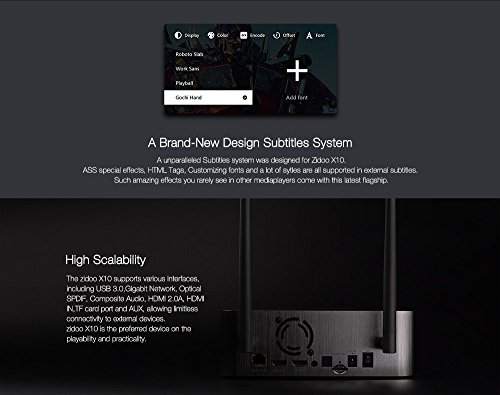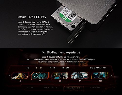 -. Feature : ★【2G+16G】2GB DDR3 RAM makes bigger games run smoothlyand the utilization of eMMC memory offers an array of benefits in terms of performance security and reliability,resulting in a richer end-user experience. / ★【 Large memory+ Support Internal 3.5" HDD Bay Box】X10 comes with 2G memory(2GB DDR3) and 16GB eMMC storage.In the meanwhile, Zidoo X10 supports an internal 3.5" hard drive up to 10TB.User-friendly tool-free for dismounting.And high-speed SATA interface,It's Perfect for download a mass of movies byTransmission or Aria (built-in APPs) and arrange them by Theater(Zidoo APP). / ★【True 4K and HDR】The really powerful processor( RealTek RTD1295DD,which comes with 64Bit A53 and Mali-T820)enable Zidoo X10 to output True 4K picture,HDR-HDMI2.0a installed in X10 can guarantee the HDR picture transmission properly,get the Clearest,highest-quality Picture.Thus,HDR (a new standard for Ultra HD TVs) and True 4K bring image quality closer to the natural world . / ★【HDMI 2.0a interface supporting HDR transmition】HDMI 2.0a added HDR(High-Dynamic Range) support based on HDMI 2.0. HDR provided far more detail ofpicture and expands the dynamic range,to get a true vision effect.Additionally,ZIDOO X10 supports both decoding and encoding of 4K@60P HEVC(h.265)10bit. / ★【The All in One Smart Media Player】The Zidoo X10 is based on Andriod 6.0, supporting built-in applications such as GOOGLE PLAY,YouTube,Netflix,Skype and many more.The unprecedented functions of LAN sharing, include full-automatic searching of SAMBA/NAS,UPnP,FTP and iTunes server,etc..X10 comes With the Gigabit Ethernet and 802.11ac dual band WIFI supporting 2.4G and 5G, 5dB Double antenna.Also with Bluetooth 4.0 supports the connection from BT speakers,keyboards,mouses and many more.