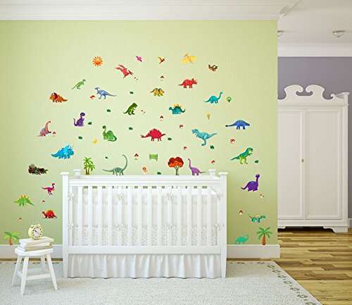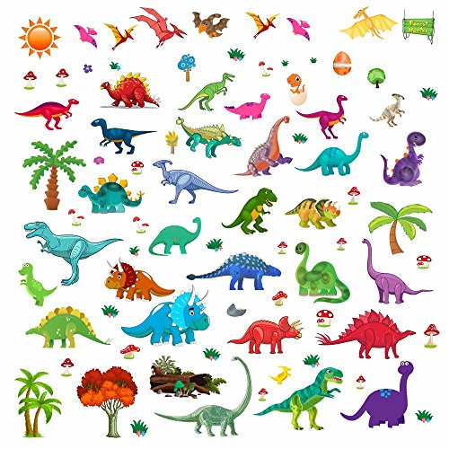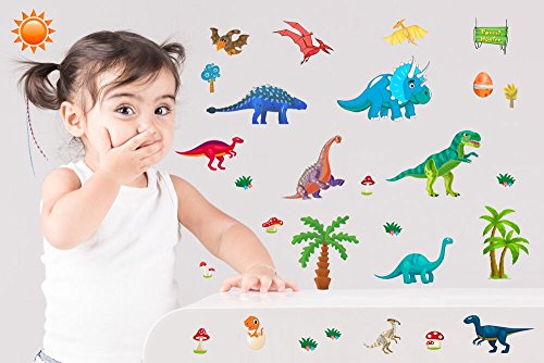 -. Feature : ✔ MULTIPLE PRECUT DINOSAUR WALL DECALS - Get 4 (18.7 x 10.8 Inches) sheets of different jurassic creatures of various shapes and sizes. Obtain realistic and cartoon t-rex, apatosaurus, brachiosaurus, triceratops, pterodactyl, ankylosaurus, stegosaurus, parasaurolophus, baby dinosaurs and dinosaur eggs. It's an educational, entertaining and self adhesive decals. It's also decorative with the many trees and palms, logs, grasses, signs and mushroom. Your child will learn while having fun. / ✔ HIGH QUALITY AND SAFETY CERTIFIED- These stickers have passed the ASTM F963 International Safety standard. Best waterproof and moisture resistant dinosaur motifs and nature decoration kit and clings to places with water and underwater. Doesn't easily detach or come off of any surface even when it's adhered to showers. Also, does not easily melt or catch on fire. It's environmentally friendly and baby safe. Kids' vinyl stickers are nontoxic and odorless and still very cute and colorful. / ✔ BEST GIFT FOR KIDS: BOY OR GIRL - It's unisex and can be applied on a girl or boy's bathroom and bedroom even babies' nursery. Ideal gift for a new mom and soon to be mommies, for baby showers or just for birthdays. Introduce love of nature and cool DINOSAURS to kids on Halloween, Christmas or any other holidays. Need good dinosaur graphics for a party? This 4 pack set is the best for you. It has a lot of accessories and pieces so it can be shared with friends. / ✔ DECORATE AND DESIGN CHILDREN'S ROOMS - These multicolored tropical dinosaur decorations can make a child's room, classroom or any other place more happy, pretty, bright, vivid and fun. Create a personalized and unique home for your children and your family. Get a 1 YEAR WARRANTY and 100% MONEY BACK GUARANTEE, no questions asked. What are you waiting for? Add to cart now! / ✔KID'S WALL DECORS THAT APPLIES AND REMOVES EASILY - Peel these big and small dinosaurs from the backing and stick on any dry, smooth and clean surfaces such as: mirrors, windows, walls, metal, glass, tiles, wood, ceramic, fabric, paper, plastic and more. Personalize any room: children's bedrooms, kitchen, living rooms, classrooms, bathtubs, closets, toddler's tables. Make them unique and enjoyable for your little ones. Easily reusable and repositionable when you transfer rooms or redecorate.