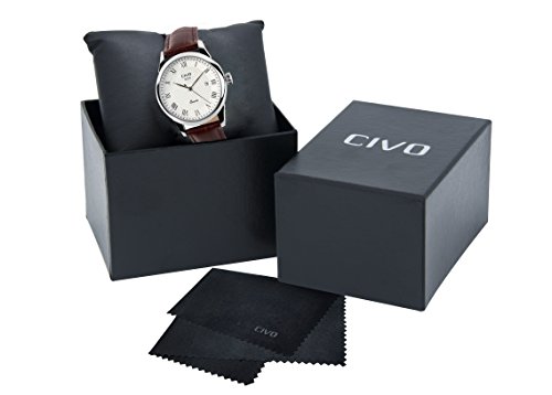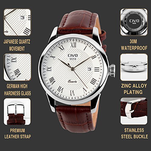 -. Feature : MORE COMFORTABLE AND DURABLE: Imported Japanese CITIZEN Movement and battery are used in CIVO wrist watch, this watch will serve for more than 3 years. And the special Genuine Leather watch strap provided is smellless, super soft, flexible and durable, which is great for daily wear. / SPECIAL DESIGN WATCH FOR DAILY USE: 30M Waterproof; IP Silver Plating Watch Case Which Will Never Fade; High Quality Luxury Genuine Leather Watch band; Key Scratch Resistant Watch Face Made of High Hardness Glass; Date Calendar; Case Diameter:40mm; Band Width:20mm, Band Length: Men's Standard / PAIR WITH ANY OUTFIT: This simple, luxury, and classical design watch will go great with any outfit and any occasion. It enables you to easily spice up a normal outfit and add style to your life. / PERFECT PACKAGE WITH BONUS: This CIVO watch is well packaged in a stylish and luxurious leather paper watch box. What's more, we also provide a free microfiber of high quality for cleaning your watch case, glasses, or other things you need it for. Unlike other seller's cheap and flimsy package, this CIVO watch will be a perfect gift for your relatives and friends. / PURCHASE WITHOUT WORRY: Each CIVO watch comes with a 12-month warranty and 90-day 100% money back full refund guarantee. If you have any dissatisfaction, please email to our after-sale team, we will refund 100% of your money back, no question asked! Click the Add to Cart button now to ensure you receive the best men's leather band casual business watch on Amazon