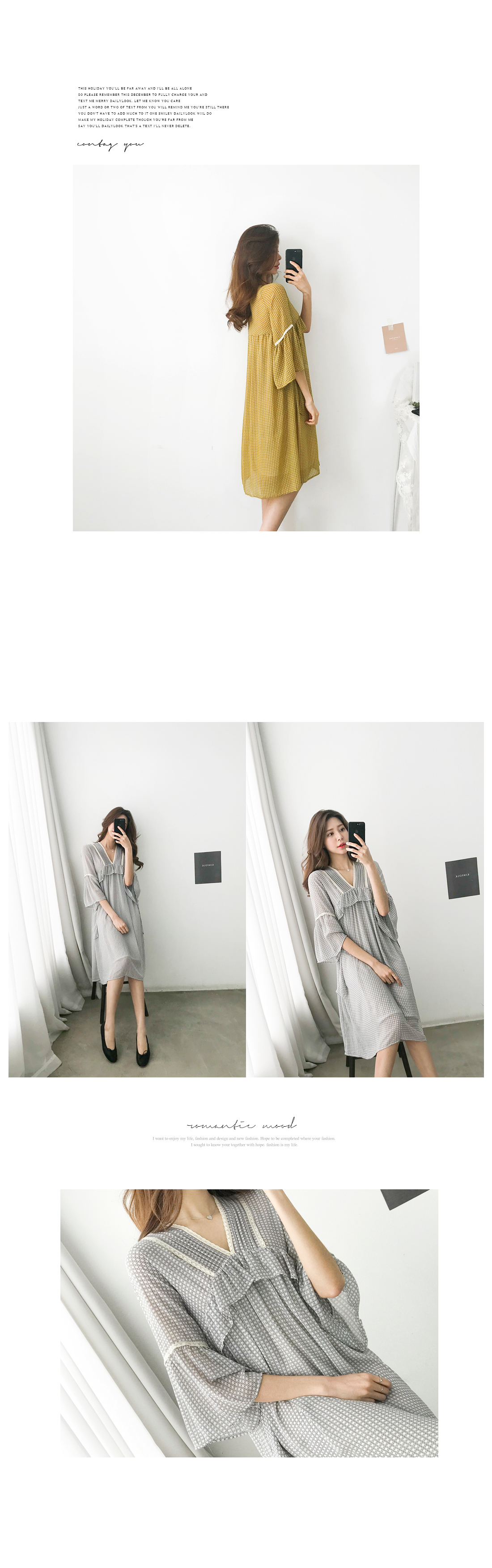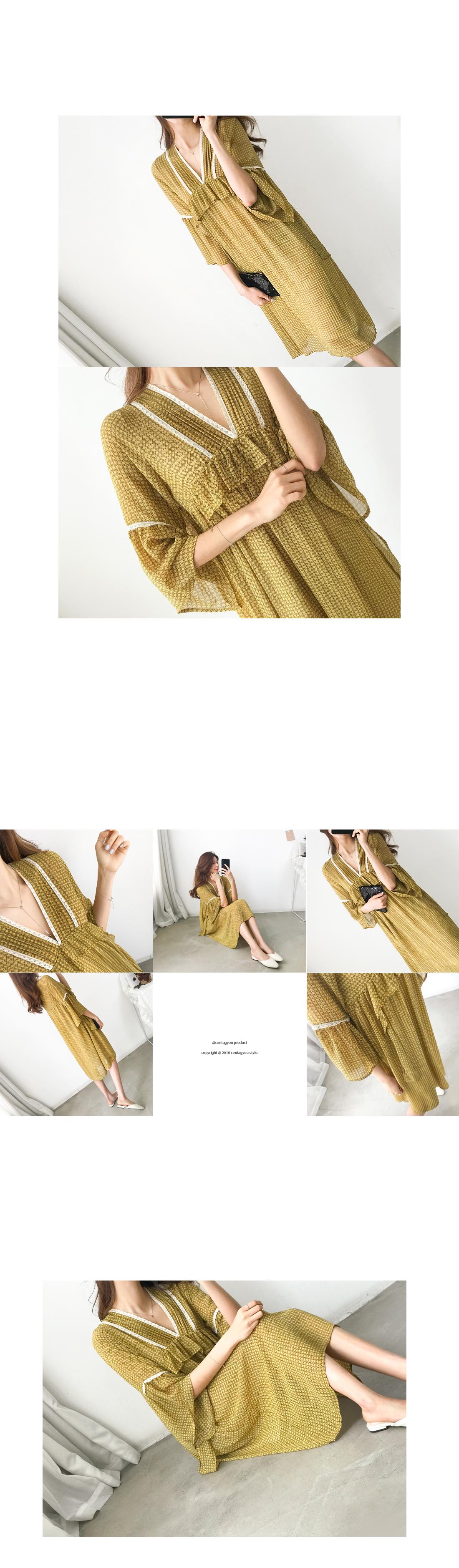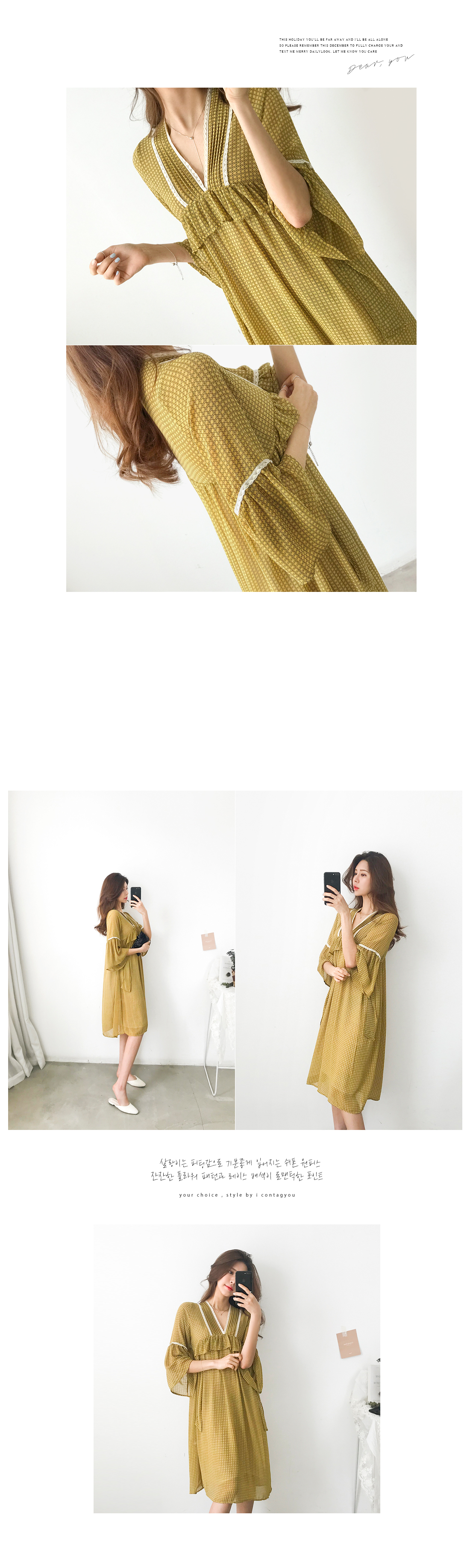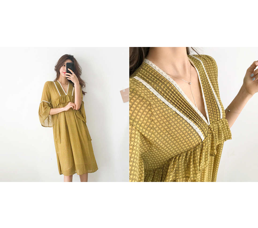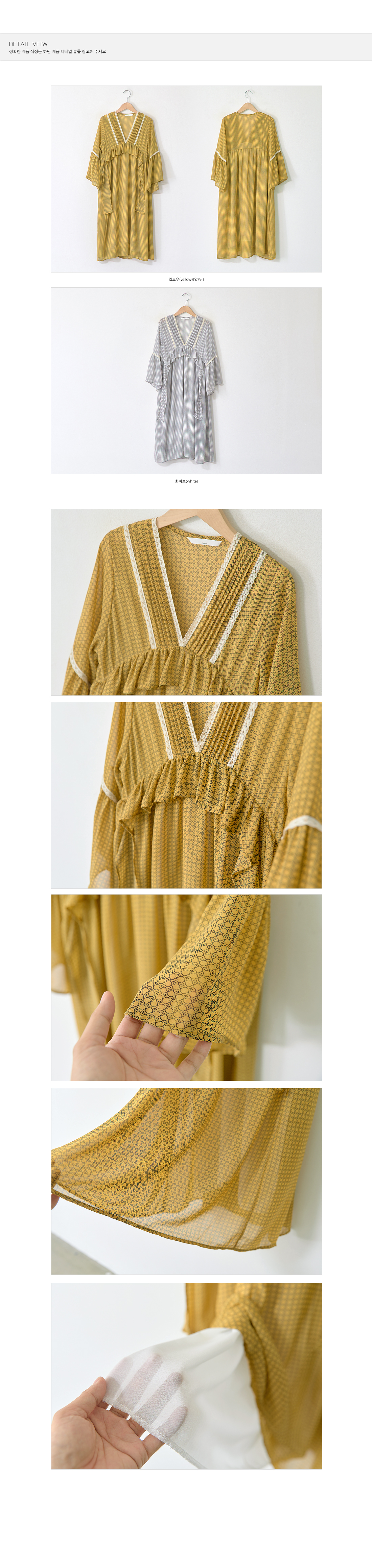 산뜻하고 가벼운 소재로 제작되어 부드럽고 기분좋은 피팅감으로 입을 수 있는 매력적인 아이템이예요. 브이넥으로 목선을 예쁘게 연출해주며, 네크라인을 따라 들어간 레이스 배색과 바스트라인의 프릴 포인트가 러블리한 무드로 포인트가 되어주고 있어요. 자연스럽게 떨어지는 숄더 라인에도 레이스를 더해주어 한층 더 로맨틱한 스타일로 포인트가 되어 주어 여유있게 플레어로 떨어지는 소매라인이 여성스러움을 강조했어요. 자연스러운 주름과 함께 편안하게 떨어지는 스커트 라인은 짧지 않은 적당한 미디기장으로 부담없이 즐겨입기 좋아요. 얇은 쉬폰 원단이지만 안쪽에 안감이 있어 비침 걱정을 덜어드려요. 추천해드려요.