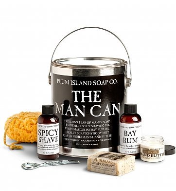 A bestselling all-natural set of skin care essentials, just for men. Plum Island Soap Co. presents The Man Can: a set of quality skin care essentials in a masculine presentation. Designed just for men, this gift is one of our most popular, and perfect for the men in your life. Included in this gift: Spicy Shave gel, Bay Rum Oil Aftershave, Heavy-Duty Hand Butter, Scrub Soap, and Body Mitt. Gift measures 8" x 7" x 7".Feature