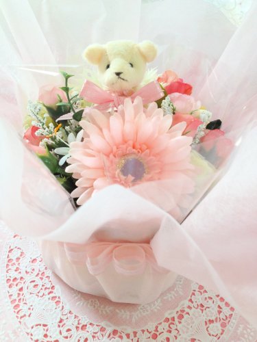 -. Feature : パンパースSサイズ 個装 19個 (Mサイズに変更も可能) / マスコット クマ 又はうさぎ1個 / シルクフラワー他多数 / ピンクリボン2重飾り / 不織布ピンク使用