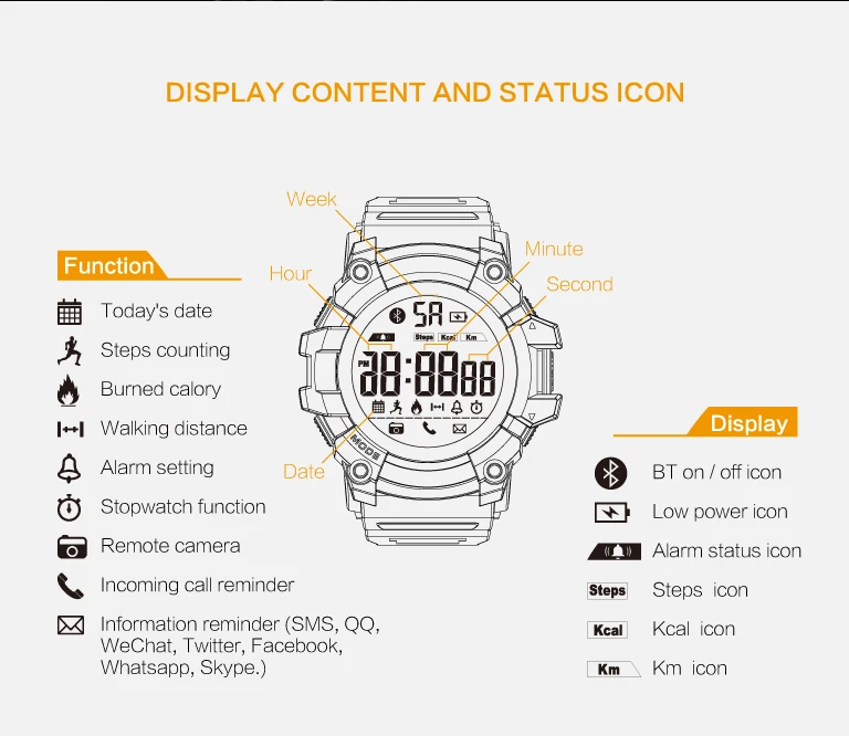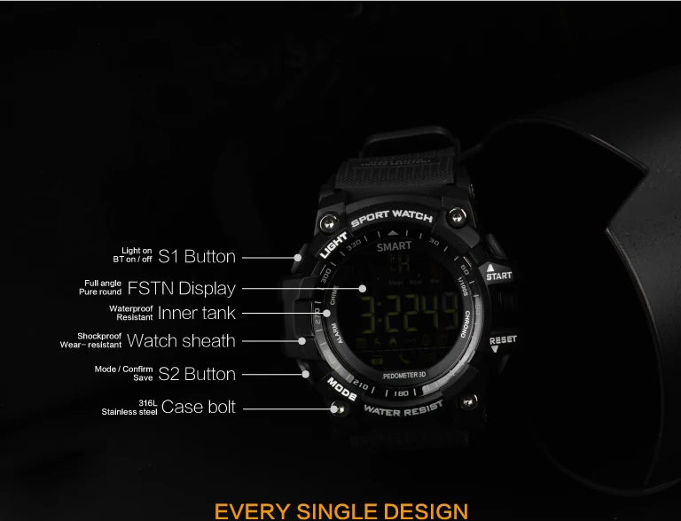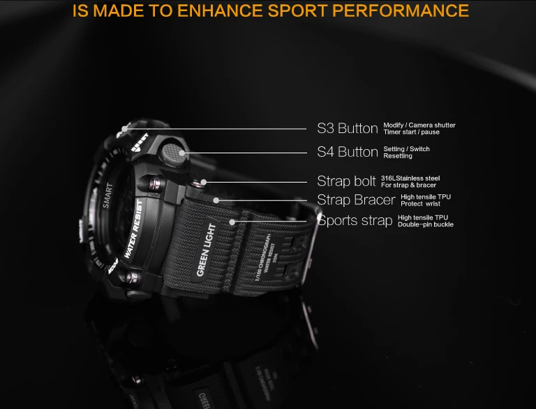 Feature:Alarm,Back Light,photography,Water Resistant,Fitness Tracker,Multiple Time Zone,Chronograph,Message Reminder,Call Reminder,Bluetooth,Shock Resistant,Repeater,Stop Watch,Complete Calendar,Swim,LED display
