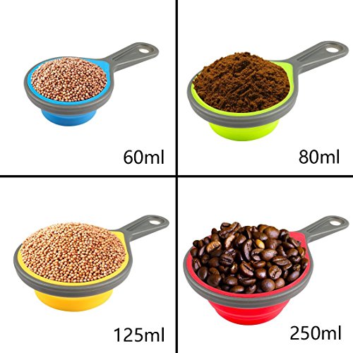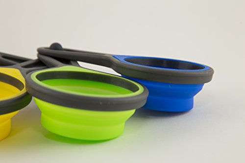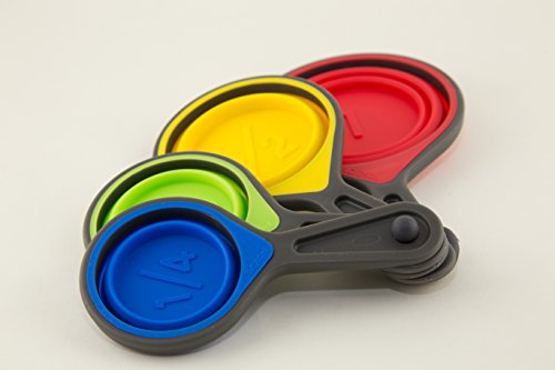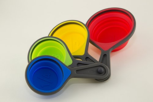 - • 4 POPOUT SILICONE MEASURING CUPS : 1 Cup/250ml, ½ Cup/125ml, 1/3 Cup/80ml, ¼ Cup/60ml. Easily flatten squish cups for storage