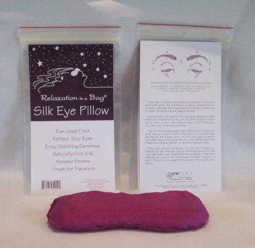 -. Binding : Misc. -. Brand : Relaxation in a Bag® -. Color : Magenta -. EAN : 0754175075751 -. Feature : Informative insert explains how and why Relaxation in a Bag eye pillows are so effective / Blocks out light to help you relax; soothes tired eyes and relieves eye strain / Use every day to help prevent puffiness and lines around the eyes / Curved ergonomic design rests directly on acupressure points around the eyes / Enjoy the fresh scent of flax seed, there is no added fragrance. PROUDLY MADE IN USA -. IsAdultProduct : 0 -. Label : More Yoga -. Manufacturer : More Yoga -. MPN : RB-13GE -. PackageQuantity : 1 -. PartNumber : RB-13GE -. ProductGroup : Health and Beauty -. ProductTypeName : HEALTH_PERSONAL_CARE -. Publisher : More Yoga -. Studio : More Yoga -. Title : Magenta Contoured Silk Eye Pillow Filled with Flax Seed from Relaxation in a Bag -. UPC : 754175075751