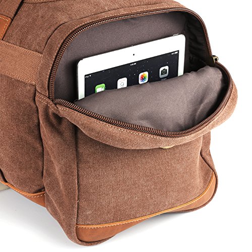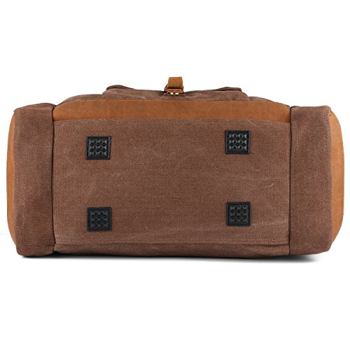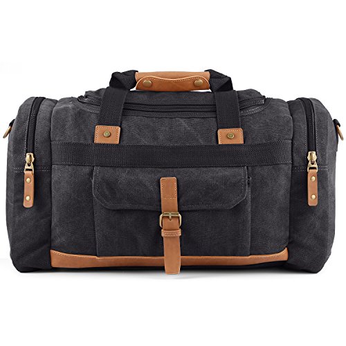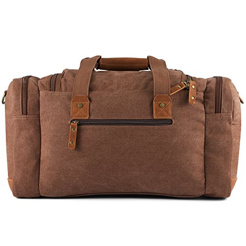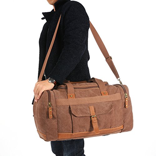 -. Feature : Material: high density cotton canvas and classical bronze tone hardware / Structure: 2*side zipper pockets, 1*front magnetic snap pocket, 1*back wall zipper pocket and 1*main compartment equipped with an inner zipper wall pocket and two open wall pocket. Multiple pockets design makes your good lay in the bag systematically / Convenient and utility: It comes with rounded stitched grip handles and an adjustable, detachable shoulder strap buckle that are convenient for versatile carrying. The zips are all large zipper, which are smooth and durable / It's two way zipper top closures design of main compartment with huge storage which can hold all your essentials for a long weekend. At the bottom of the bag, our duffel bag equips with high quality plastic cushions, which makes the bag well resistance to dirty / Multi-functional: This travel duffel bag can hold all your daily essentials like clothes, shoes, etc. It's suitable for anyone on travelling, camping, business, sporting