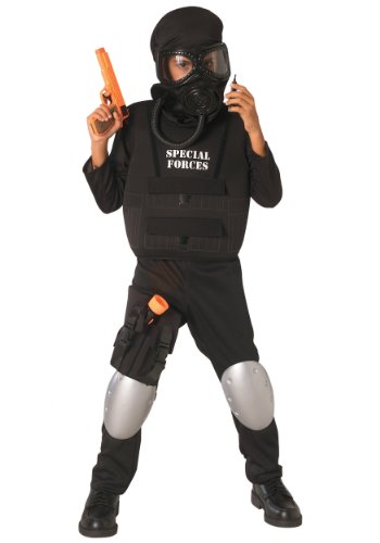 -. Feature : Includes: Mask, Jumpsuit, Vest, Knee pads, Leg pouch, Gun, Flashlight, Walkie Talkie, ***2 AA batteries NOT included