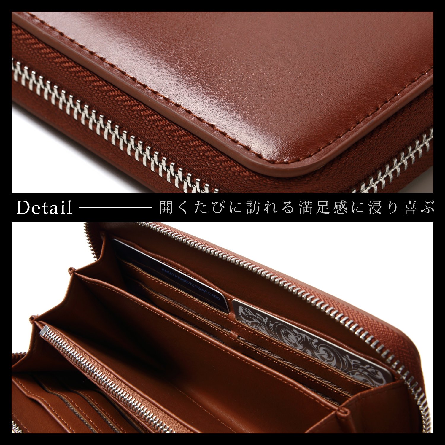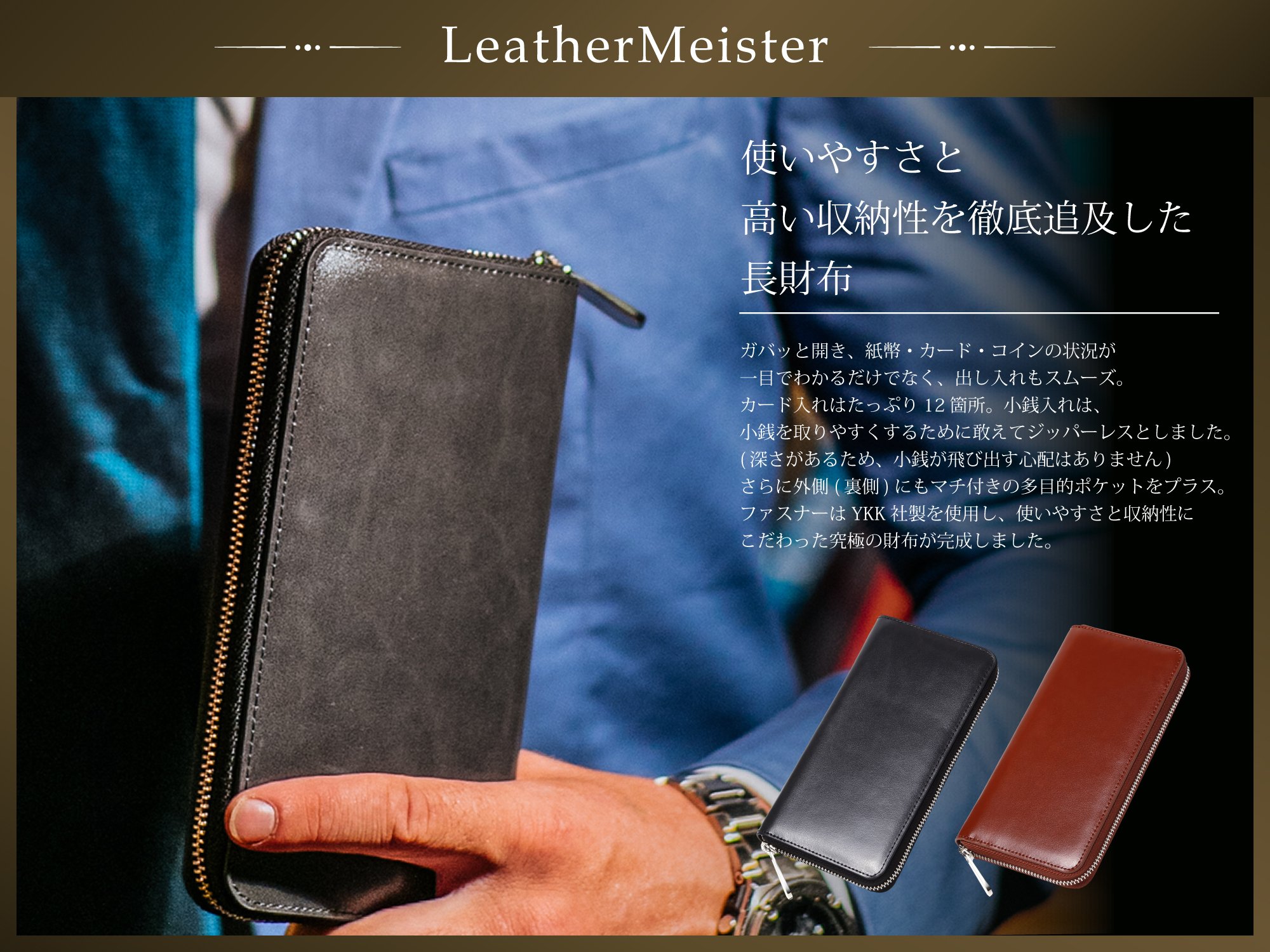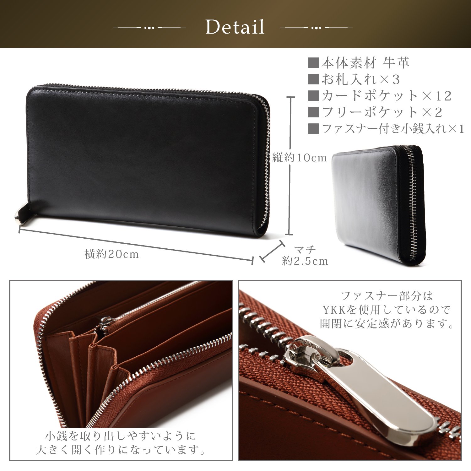 The zipper is made by YKK Co., Ltd., a wallet sticking to ease of use and storage ability.