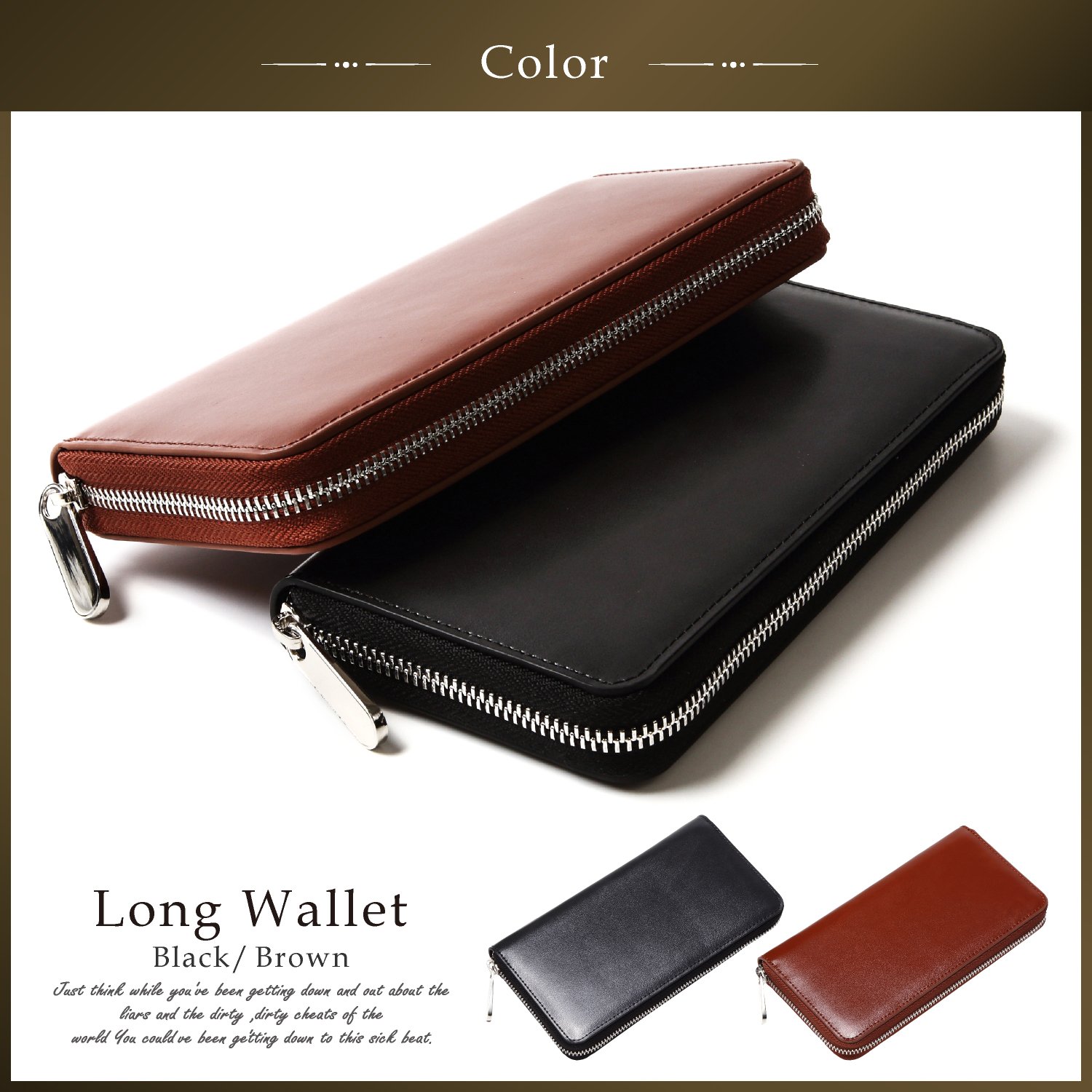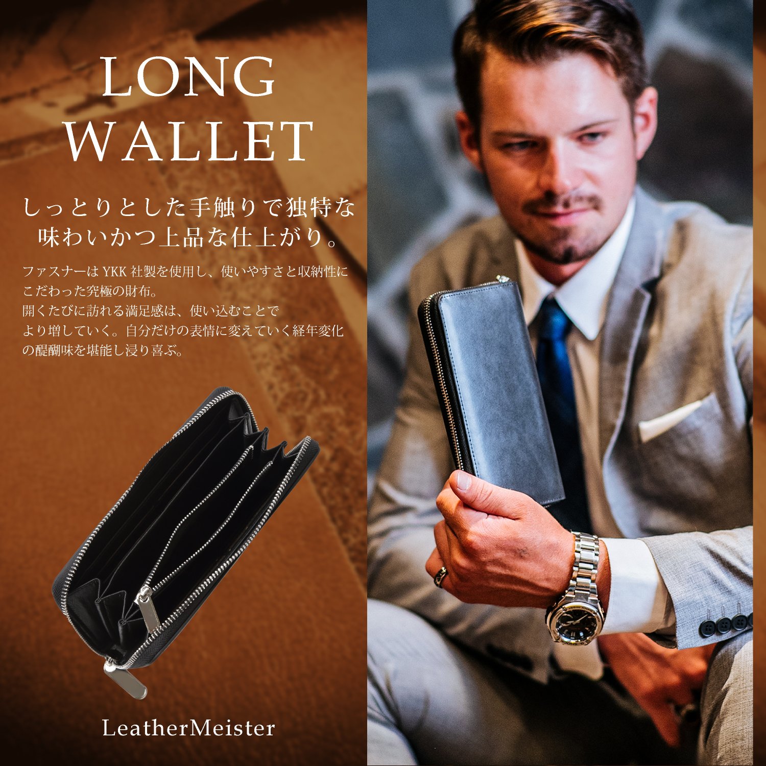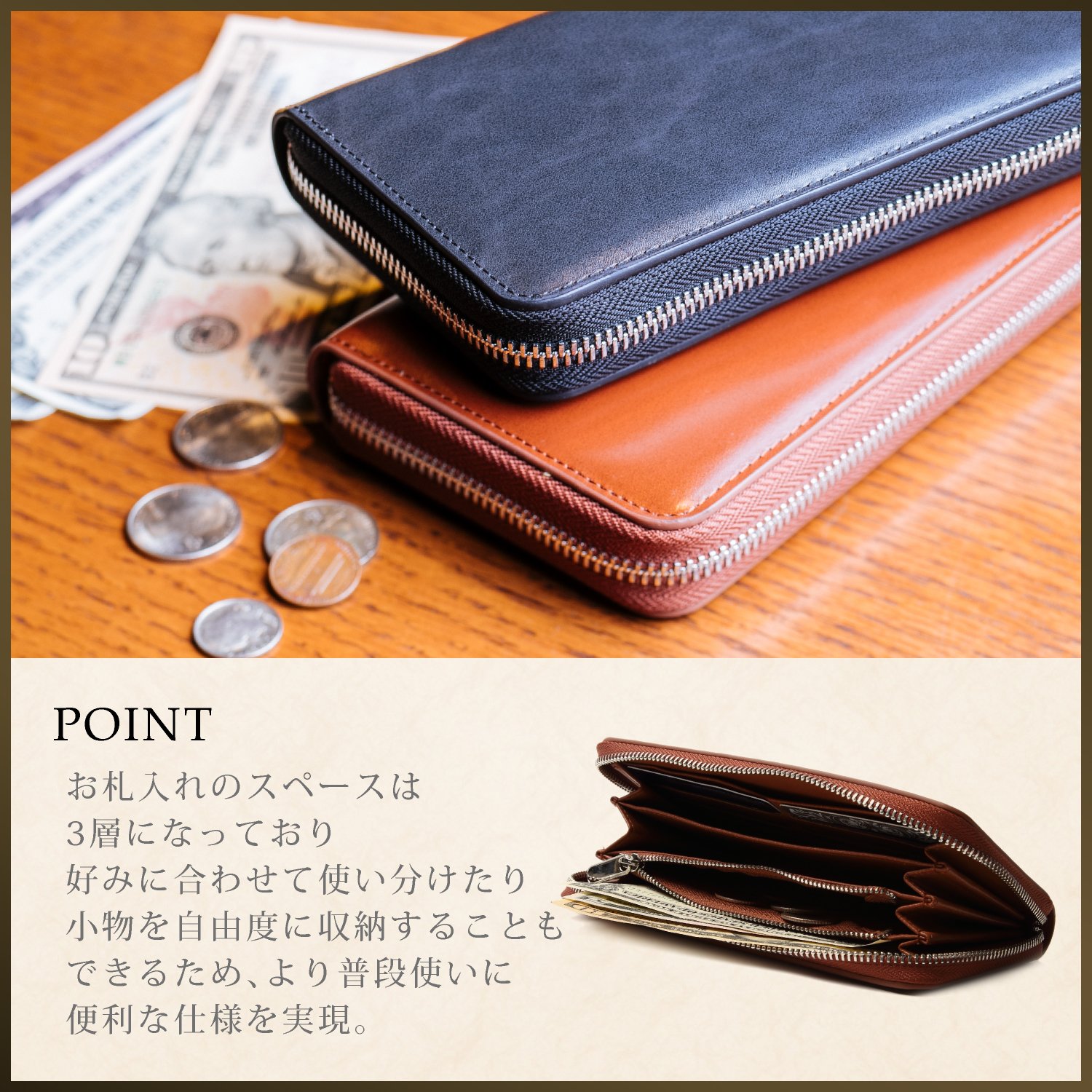 The zipper is made by YKK Co., Ltd., a wallet sticking to ease of use and storage ability.