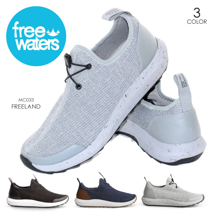 スッキリとしたアスレチックスタイリングが特徴的なスリッポンシューズ。20年以上靴の開発に携わっている開発者が今までで一番快適なシューズが出来たと称賛しました。すべてが最新の快適素材で作られているため、クッション性の高い厚めのソールからは想像できない軽さです。フィット感も抜群でまるで裸足でいるかのような錯覚を生みます。もちろん他シューズやサンダルと同様で土踏まず部分のアーチサポートがあり疲れを軽減してくれる機能もあります。一回り大きく作られたアウトソールが想像を絶する安定感を提供してくれます。地面と足が繋がっているかのようなフリーランドはまさに自由の為に作られました。