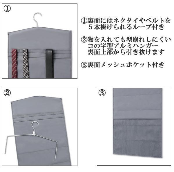 ワイシャツをまとめて省スペース収納できる便利なワイシャツケースです。裏面にはネクタイやベルトが5本掛けられるループと、小物などを収納できるメッシュポケットが付いています。360度回転するアルミハンガーで色々なところに掛けられます。 |