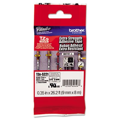 -. Title : Brotheramp;reg; P-Touchamp;reg; - TZe Extra-Strength Adhesive Laminated Labeling Tape, 3/8w, Black on White - Sold As 1 Each - For labeling in harsh environments on a variety of plastics, painted surfaces and textured surfaces.