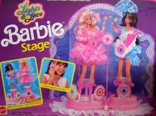 -. Feature : Lights & Lace Barbie Stage is a 1991 Arco Toys, Mattel production. / Includes: ama, Stage, Microphone. Keyboard, Pretty Jewelry For You & More (Sorry, NO content info on box.). All details are to the best of my ability; colors, sizes, styles & info may vary. / Move the Lever on the Stage & See dolls dance; NO DOLLS included. Playset intended for Barbie & 11.5" fashion dolls; NO DOLLS included. / For Ages 3+ Years. SIMPLE ASSEMBLY REQUIRED. See more details below in PRODUCT DESCRIPTION. / Playset intendedPLEASE check in CONDITION NOTE/Comments for the Box Condition Information.