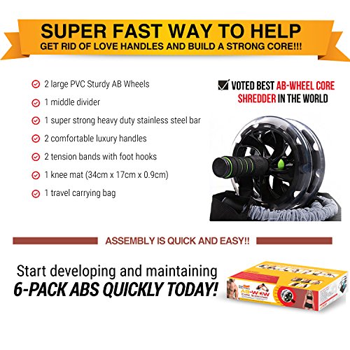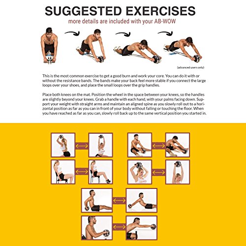 - Feature : ✔ Complete ab exercise equipment includes PREMIUM BONUSES: 2 resistance bands, knee pads, comfort grip handles, exercise guide and travel bag. / ✔ Everything your core needs for an abs workout. Sculpt a flat stomach and six pack abs. You'll feel the burn as you build muscle and burn fat. / ✔ Included Resistance bands make this the most complete ab wheel trainer to strengthen 5 body parts: abdominals, shoulders, arms, and upper / lower back. / ✔ Quiet, smooth rolling dual wheel system works with no wobble on any floor type. The large, sturdy PVC ab roller wheels support heavier body weights. / ✔ The ABWOW is a heavy duty, sturdy ab wheel home gym in a box built to last. If a part becomes damaged or is accidentally lost, we'll replace it for free.