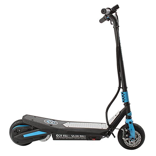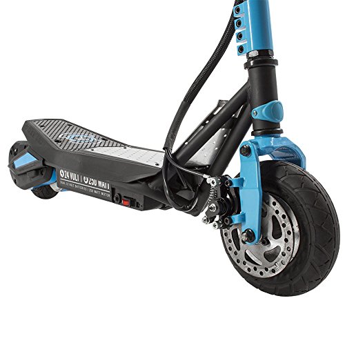 -. Feature : 2-wheeled electric scooter with chart-topping 250-watt chain driven motor and speeds up to 15 mph / Ultra heavy-duty, triple-tube steel frame provide maximum component protection and durability / Moto-inspired Instant Throttle Response (ITR) twist throttle, caliper disc handbrake, and oversized deck surface enable enhanced control / 24-volt sealed lead acid rechargeable battery system for a continuous ride time of up to 40 minutes / Designed for riders 13 years and older, weighing up to 150 lbs.