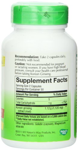 -. Binding : Health and Beauty -. Brand : Nature's Way -. Department : Health and Beauty>Health and Wellness -. EAN : 0033674133002 -. Feature : Packaging May vary, Asian or Korean Ginseng -. IsAdultProduct : 0 -. IsAutographed : 0 -. IsMemorabilia : 0 -. Label : Nature's Way -. LegalDisclaimer : * These statements have not been evaluated by the Food and Drug Administration. This product is not intended to diagnose, treat, cure or prevent any disease. ** Always refer to the manufacturer's label on the product for description, recommended dose and precautions. -. Manufacturer : Nature's Way -. Model : 13300 -. MPN : 13300 -. NumberOfItems : 1 -. PackageQuantity : 1 -. PartNumber : 13300 -. ProductGroup : Health and Beauty -. ProductTypeName : HEALTH_PERSONAL_CARE -. Publisher : Nature's Way -. ReleaseDate : 2010-05-13 -. Size : 100 -. Studio : Nature's Way -. Title : Nature's Way Ginseng, Asian, 100 Capsules, 560 mg (Packaging May Vary) -. UPC : 033674133002