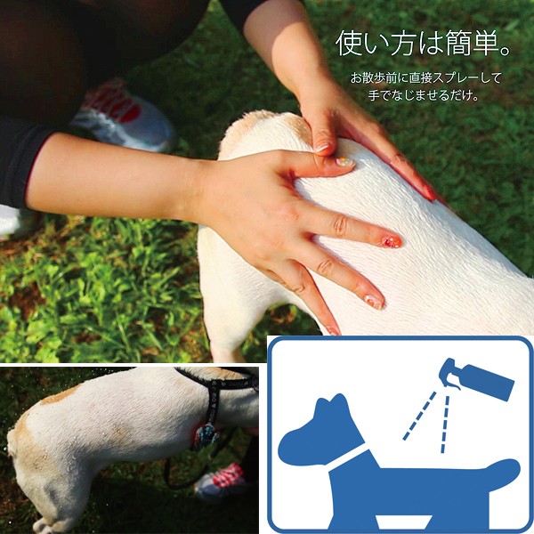 パートナーの顔にかからないように全身に適量をスプレーしてください(長毛の場合は軽くブラッシングして被毛になじませてください)。