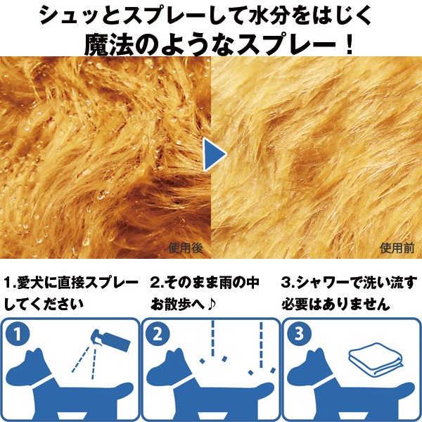そんなときにはレインザーガード!パートナー(愛 犬)の身体にシュッとスプレーすれば、被毛が雨をはじきます。