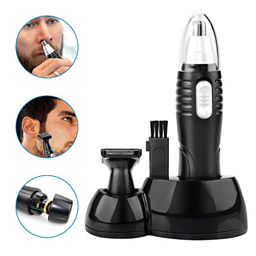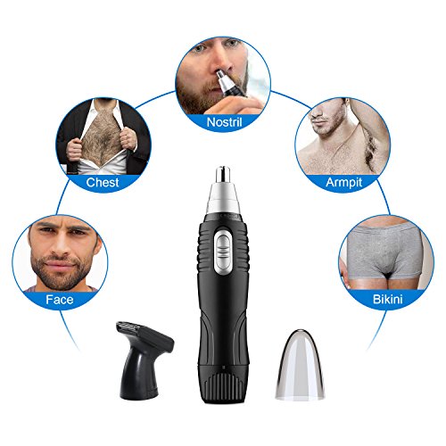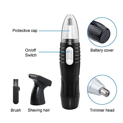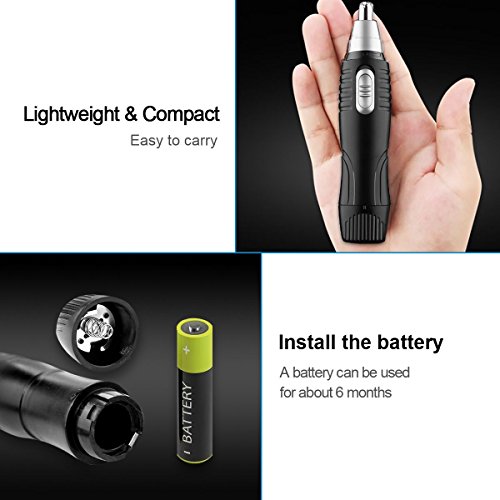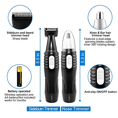 - LIGHTWEIGHT & COMPACT --- Includes two trimmer heads, one protective nose trimmer cap and one cleaning brush, and one store base for quick maintenance. Nose and ear clipper design, fully powered with one AA-size battery (not included).