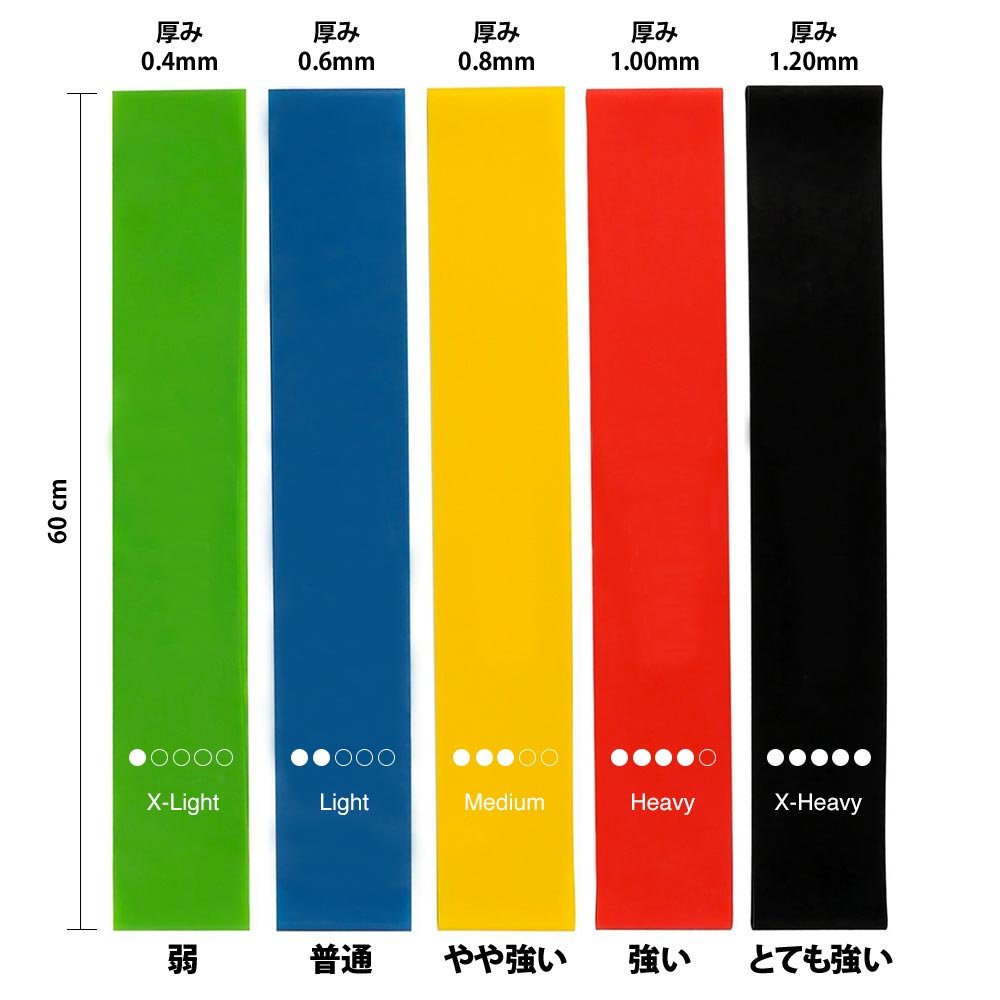 Although these short ring-shaped rubber bands are often expensive, this item is reasonably priced with 5 strengths set. I think that COSPA is good because durability which was uneasy at the beginning of use is not yet cut out so far. However, as training progresses, there are almost no turns for items with weak strength from the bottom, so I think that it is even better if strength selection is possible at the time of purchase.