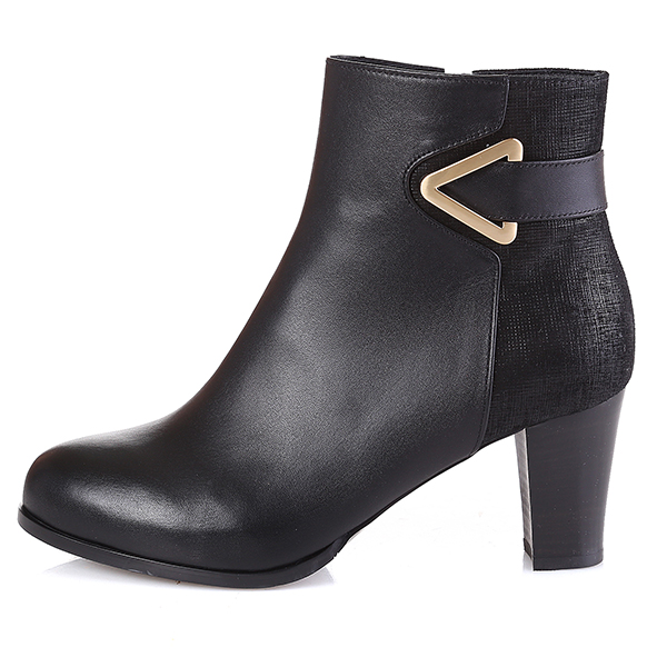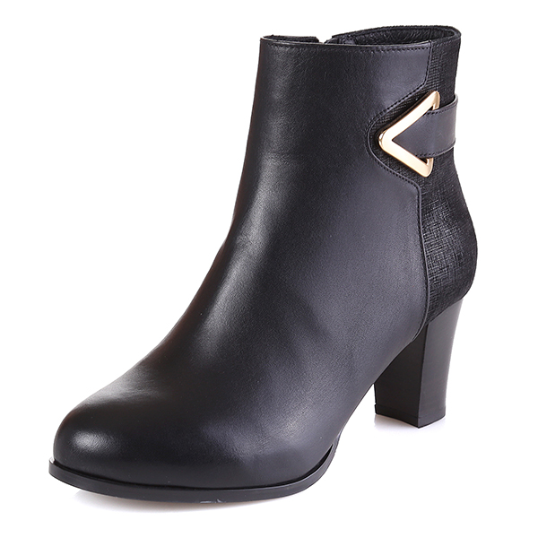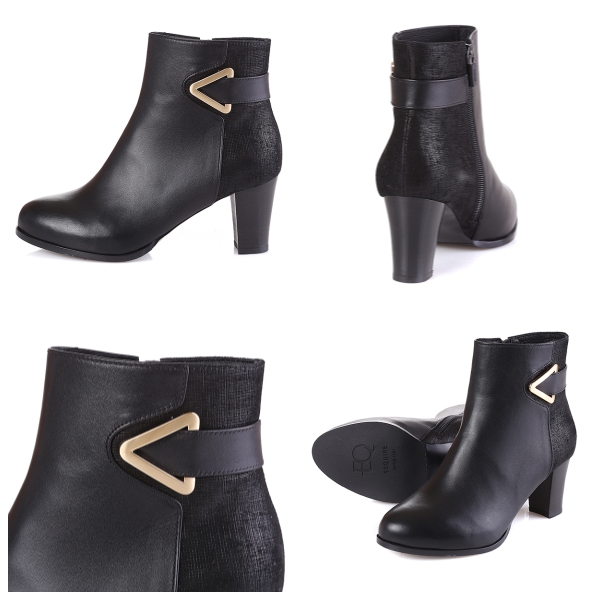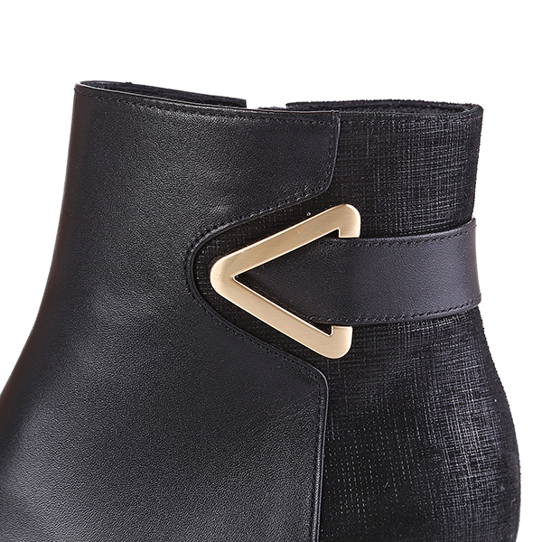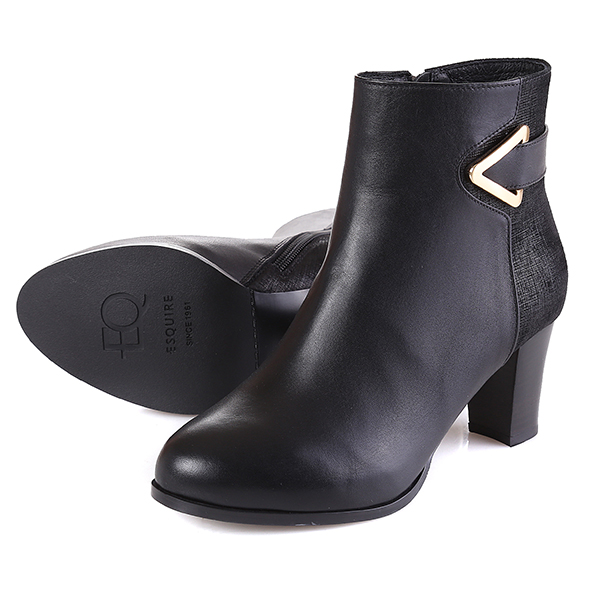 삼각형의 금속장식과 뒤쪽의 텍스쳐가 다른 가죽을 콤비로 디테일을 더한 앵클부츠. 기본형 스타일로 데일리한 아이템으로 활용도가 높음.