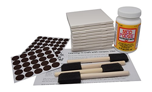 Kit includes 10 White tile, exclusive guide for how to create the project, mod podge (8 oz), craft sponge brushes (4) and an assortment of felt pads to use to protect the surface of your furniture