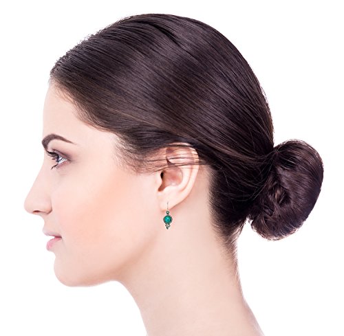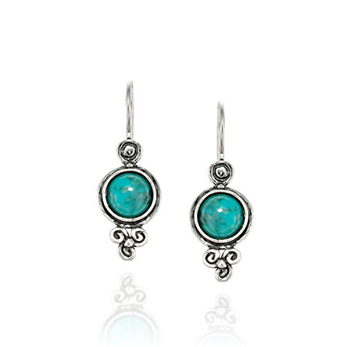 Antique style Turquoise Sterling Silver diamond-shaped dangle earrings with decorative floral design. 925 Sterling Silver dangle earrings with 2 mm round cabochon reconstituted Turquoise gemstone. These elegant earrings measure about 5/8" or 1.6 cm in size excluding the nickel free Sterling Silver French wire hooks. These earrings are lightweight and the Silver diamond-shape is open in the back. Unique artisan design.