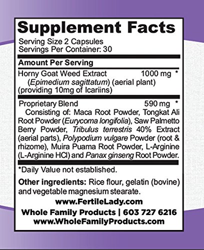 Fertile Lady includes many natural herbs and whole foods including Horny Goat Weed, Maca, Macuna Pruriens, Arginine, and Ginseng, which when taken together are known to help improve sexual libido of women and promote proper follicle development and increase chances of getting pregnant.