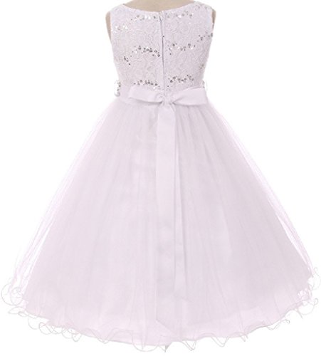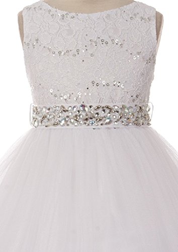 Beautiful sleeveless tulle dress that features a gorgeous bead embellished waist that gives the dress pizzazz. The bodice is embroidered with lovely eye catching sequins. Sash can be tied in the back to your desired fit. The tulle skirt features a curled hemline. Perfect option for wedding as a flower girl dress, junior bridesmaid gown, attendant, graduation, holiday, parties, pageants and any other special occasion.Feature