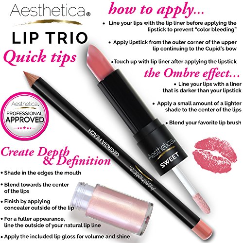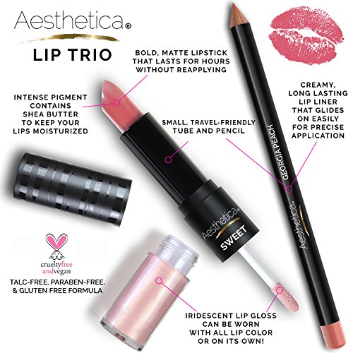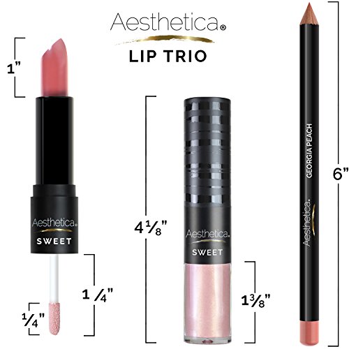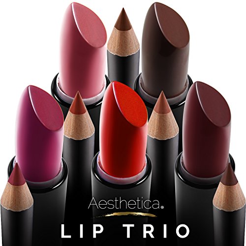 Luscious lips are as easy as one, two, three! The Aesthetica Lip Trio Sets does it all from lining and filling with rich color to polishing with a gorgeous shine, plus all the trendy ombre and contour looks. Unlike the Kylie Lip Kit, the Aesthetica Lip Trio includes a double-ended tube with a retractable matte lipstick and an iridescent gloss is paired with a complementary lip liner. Define, volumize and add a punch of color with the flick of a wrist.