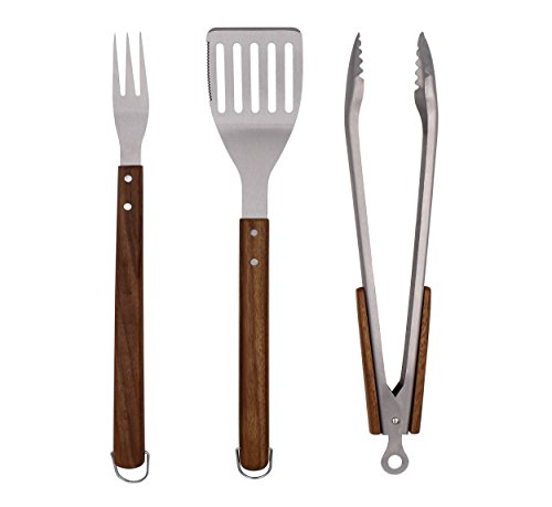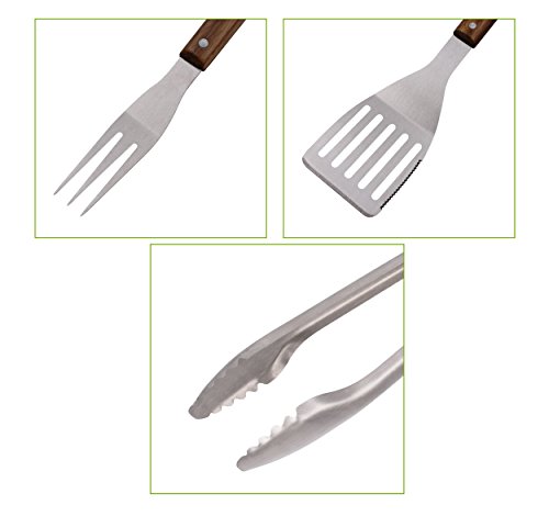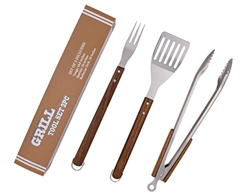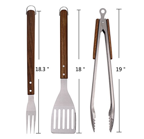 BOBZYXL BBQ Grilling Tool Set 18-inch 3-Piece, Heavy Duty Stainless Steel Spatula, Fork & Tongs, with Solid Wood Handle