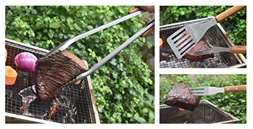 Made from professional grade heavy duty stainless-steel with long solid wood grips, help you conquer your food without grilling your hands. Extra thick. Solid stainless steel. Never worry about your tools bending, breaking or rusting again