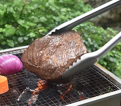 GRILLING TONGS - The tongs consist of 2 pieces joined together at a spring loaded hinge, then lock shut to save you space and hassle. Scalloped tongs to allow handling of delicate foods, like fish, without tearing