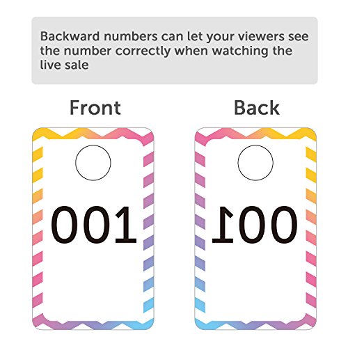 100 Pieces plastic number tags: numbers from 001 to 100; One side is normal and other side is backward numbers; Reverse numbers enable viewers to see the numbers correctly when watching your live sale