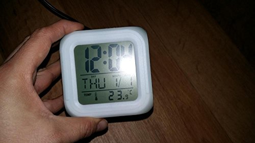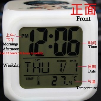 -. Feature : Material : PVC. Dimensions : 80mm*80mm. Glowing LED light with 7 different color changing. / Support 12-hour and 24-hour time format, calendar, temperature and alarm. (not include battery). / Alarm Clock LED light Worked by 4 x AAA batteries or DC2.5 Adapter (WE PROVIDE A CABLE - ADAPTER NOT INCLUDED - PURCHASE SEPARATELY) ; LCD screen powered by 2x AG13 batteries (INCLUDED). / Package includes : 1 pcs clock, 2 button batteries, 1 cable without adaptor, manual, and single box packaging. / Arrive within 3-5 weeks.