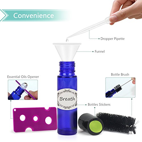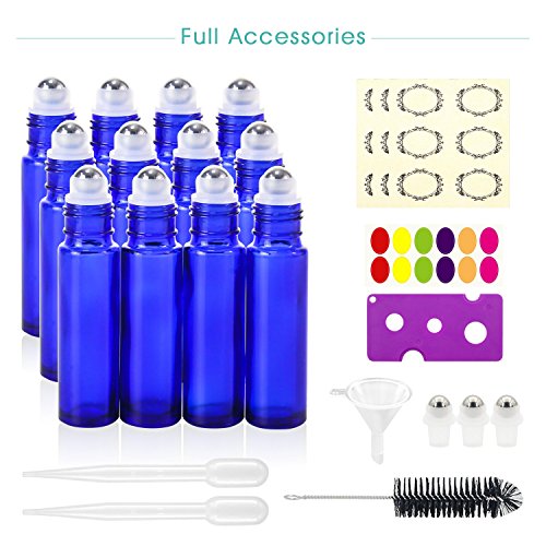 - ★VALUE SETS - 12 Pack 10ml cobalt blue essential oil roller bottles with leak proof design metal roller balls and black caps. Including 3 extra ordinary roller balls, 30 pieces labels, Opener, funnel, dropper and brush which are perfect for making handmade oil blends